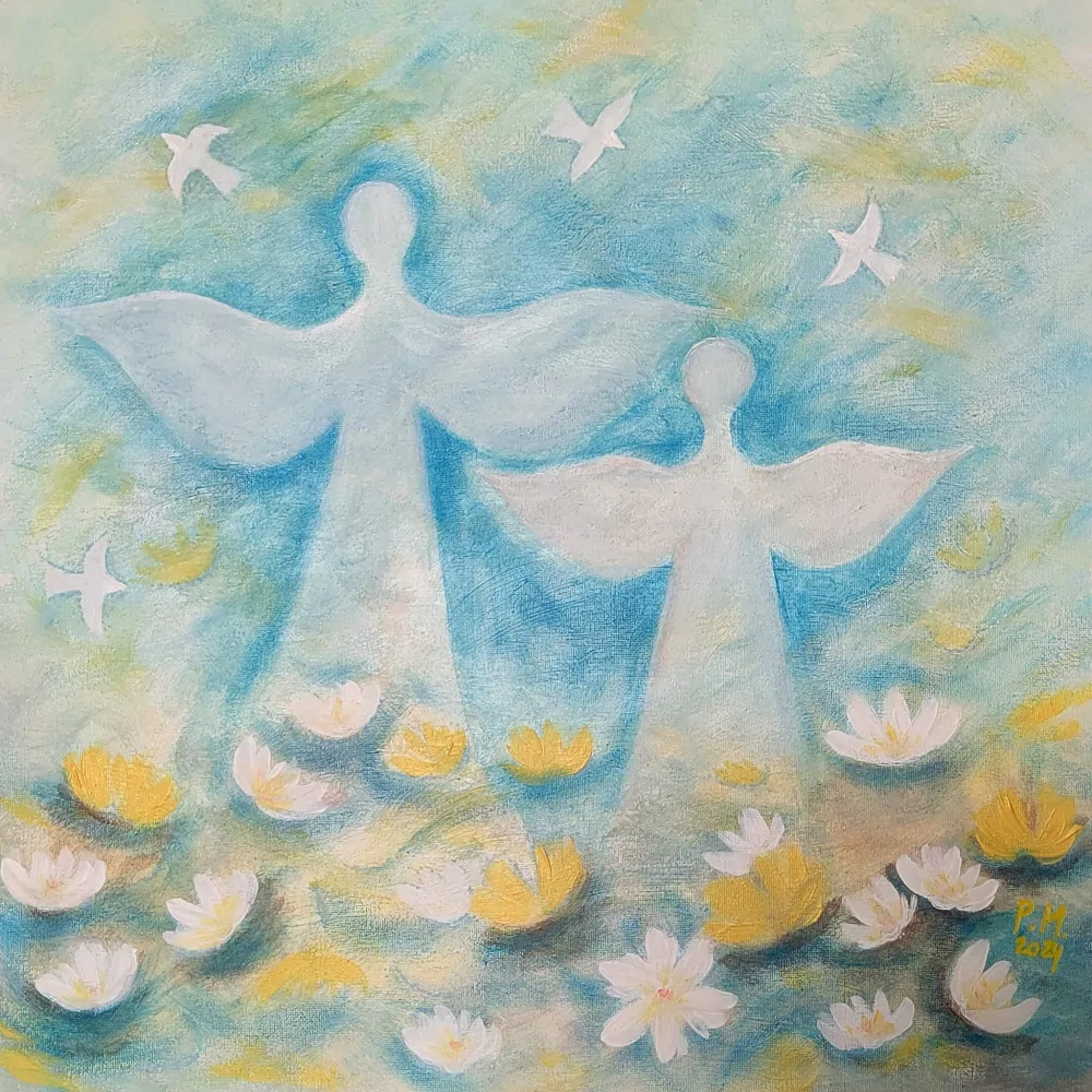Jsou dny, kdy potřebuješ pomoc, kdy se necítíš jistě, kdy nechceš být sám na život... I když je nejhůř, pamatuj, že nikdy nejsi sám... všude kolem nás jsou andělé strážní, pomocníčci, průvodci a i když je očima nevidíš, srdcem je můžeš vycítit... tento obraz je připomenutím, že všude kolem nás v ten pravý čas najdeš své ochránce, průvodce, nikdy nebudeš na nic úplně sám, bez pomoci... všímej si znamení, hledej kolem sebe, dívej se do nebe, hledej ve slunečním svitu, mezi kapkami rosy, mezi námi všemi... jsou tu a tyto anděly, zachycené mou rukou na plátno, si můžeš pro upokojení pověsit u sebe doma... budou už navždy s tebou...
